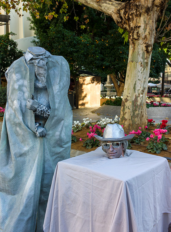A Siviglia certamente da non mancare sono Alhambra e Giralda, molto vicine l'una all'altra, complessi monumentali di grande spicco e di indubbio valore artistico. È opportuno alternare l'uso del grandangolo, per le architetture assai imponenti, a quello del teleobiettivo per dare importanza anche ai dettagli, l'avvicendamento del grande al piccolo e del vicino al lontano giova ai fini del racconto fotografico del viaggio. Un valore cromatico che si aggiunge in questa stagione e di cui è bene approfittare, è la fioritura degli alberi di arancio che con la loro macchia di colore vivace e inusuale arricchiscono i nostri scatti. Volendo evitare i luoghi "consacrati" si può anche cercare qualche risvolto attuale e non necessariamente storico: ho avuto la fortuna di incappare in una coppia di mimi di strada che mi hanno offerto la possibilità di uno scatto interessante. Non è tassativo che si debba ritornare dall'Andalusia con un'immagine della corrida o di danzatrici di flamenco...